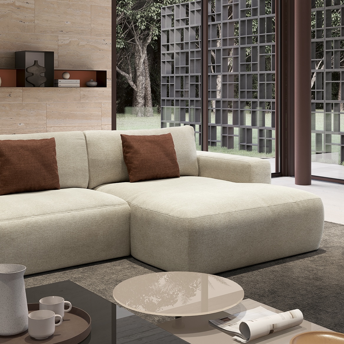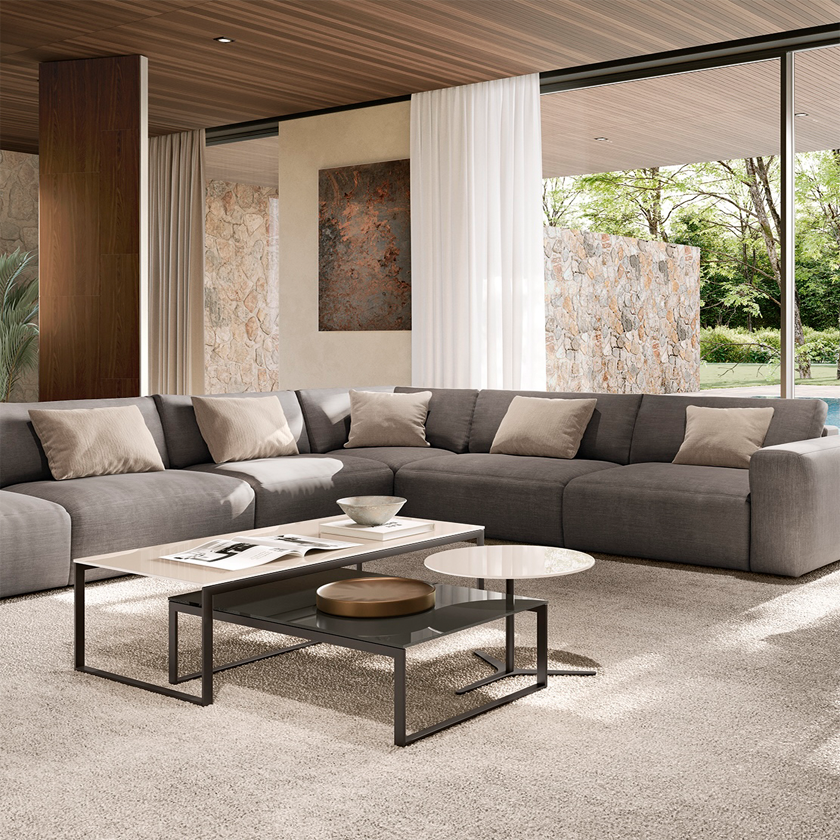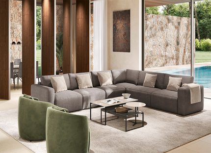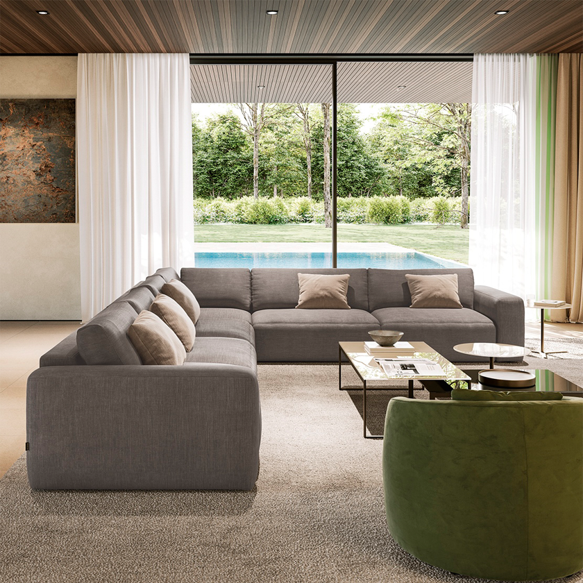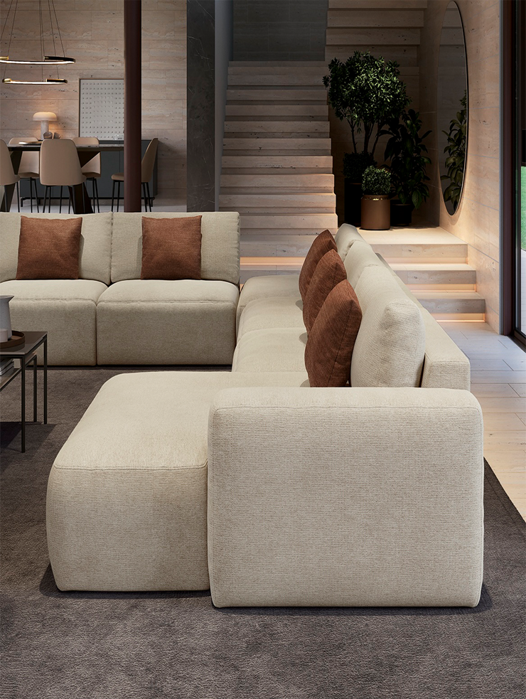 Благодаря симметричной модульности и универсальному шезлонгу, Parioli легко адаптируется к любому помещению. Он одинаково хорошо смотрится у стены и в центре комнаты, сохраняя ощущение простора и свободы.