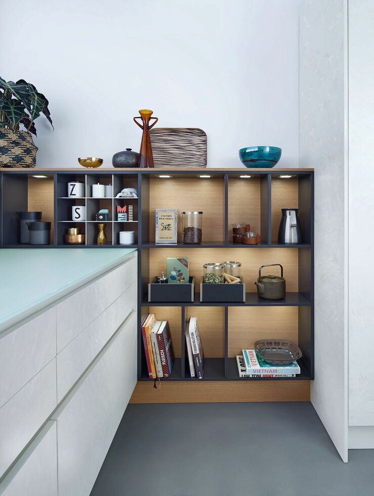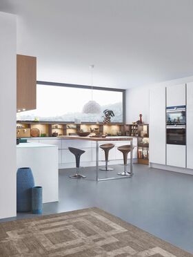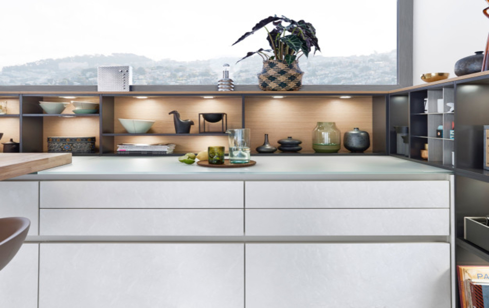 Материал и цвет этой кухни излучают вневременную эстетику: CONCRETE дакар, бетон в прерывающемся белом цвете в качестве материала фронта, поверхность мелко структурирована благодаря нанесению вручную. Модульный наставной стеллаж со светлой задней стенкой из дерева оформляет стену над столешницей