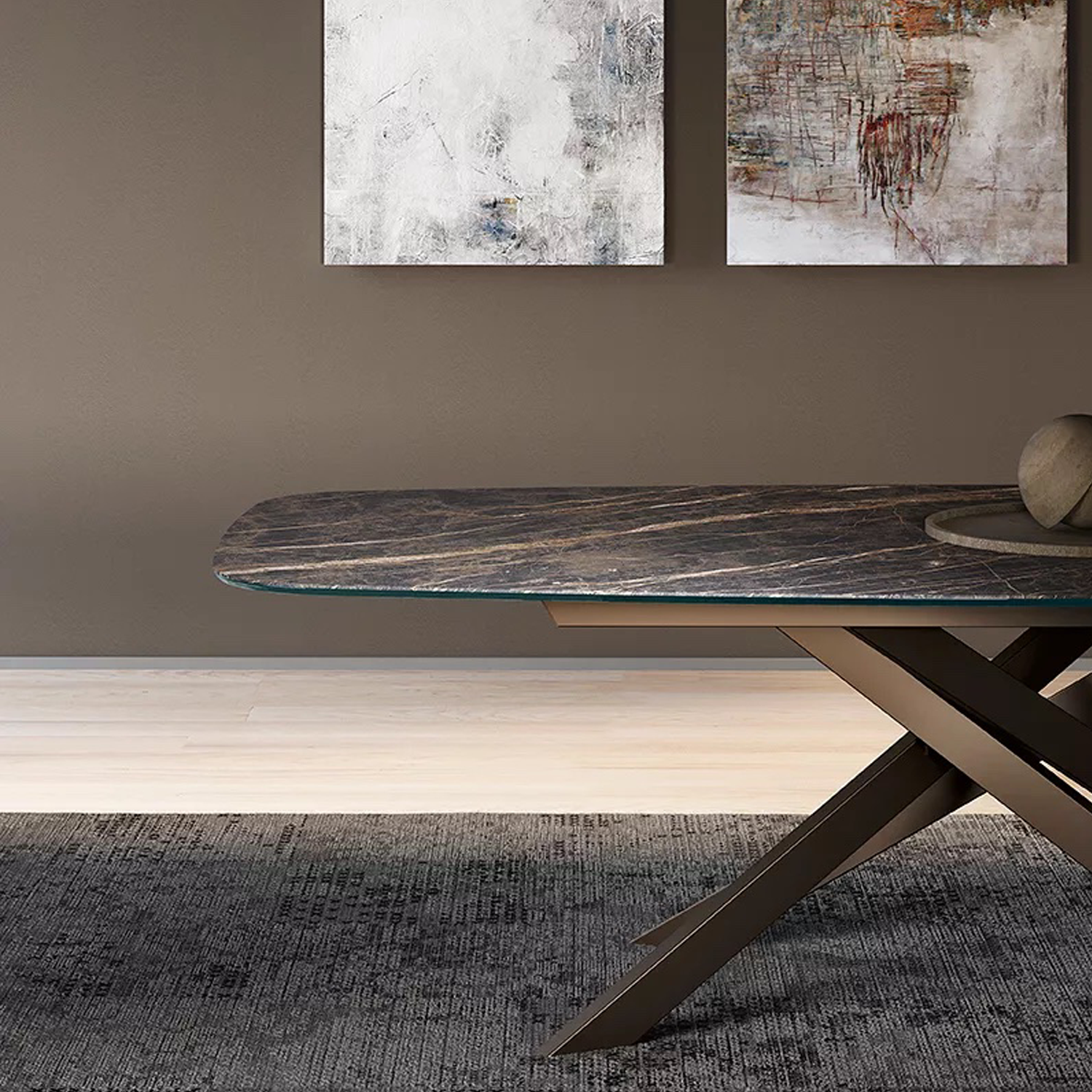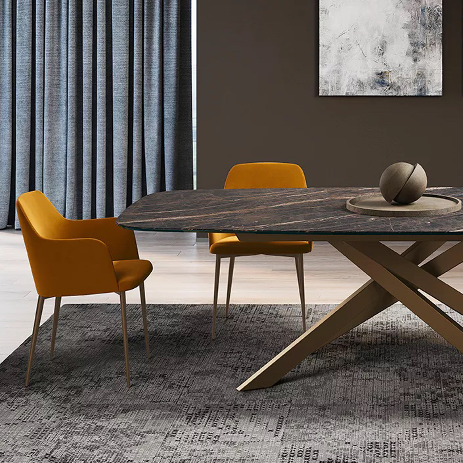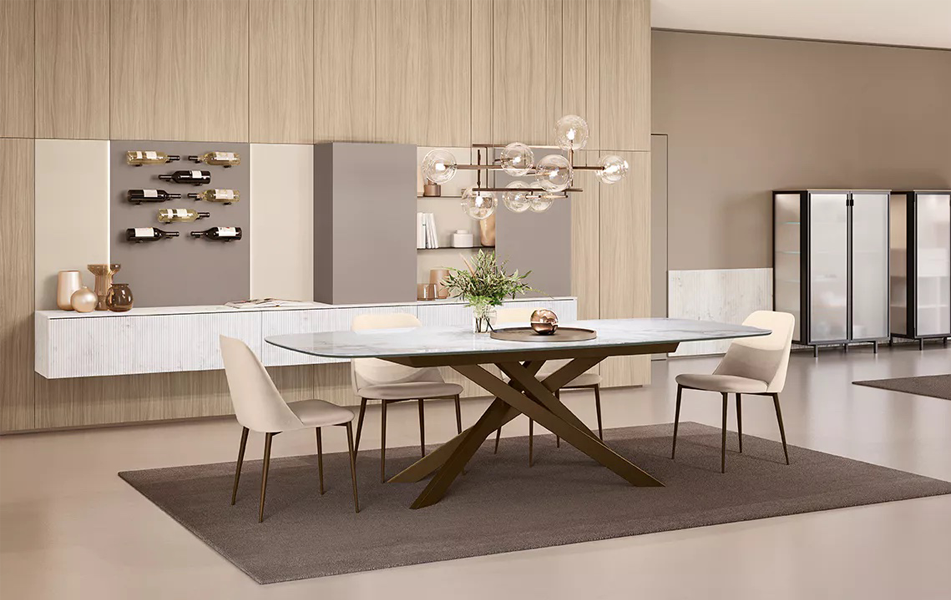 Bliss создан для тех, кто ценит свободу выбора и стиль в каждой детали. Его тонкая металлическая основа в оттенках антрацит, чёрный, тёмная латунь или песочный сочетается с множеством вариантов столешниц: от натуральной текстуры дерева до глянца стекла или изысканности Supermarmo. Прямоугольный или овальный, фиксированный или раздвижной — Bliss легко впишется в любую обеденную зону, делая каждый приём пищи особенным.