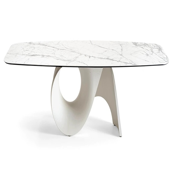 Столешница может быть выполнена из стекла или керамики, сочетаясь с бетонной базой и создавая эффект удивительной лёгкости. Такая модель станет центром внимания в дизайнерском доме, стильной столовой или представительской зоне — «скульптура» для ежедневного использования.