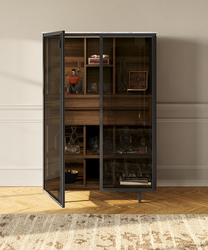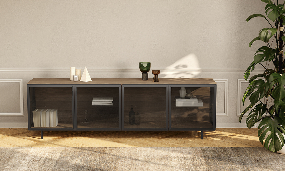 Комод Aurora — это стильный акцент с архитектурным характером. Его изящный силуэт основан на визуальной лёгкости: тёмный металлический профиль в оттенке Carbon обрамляет стеклянные фасады, создавая выразительный контраст и подчёркивая геометрию конструкции.