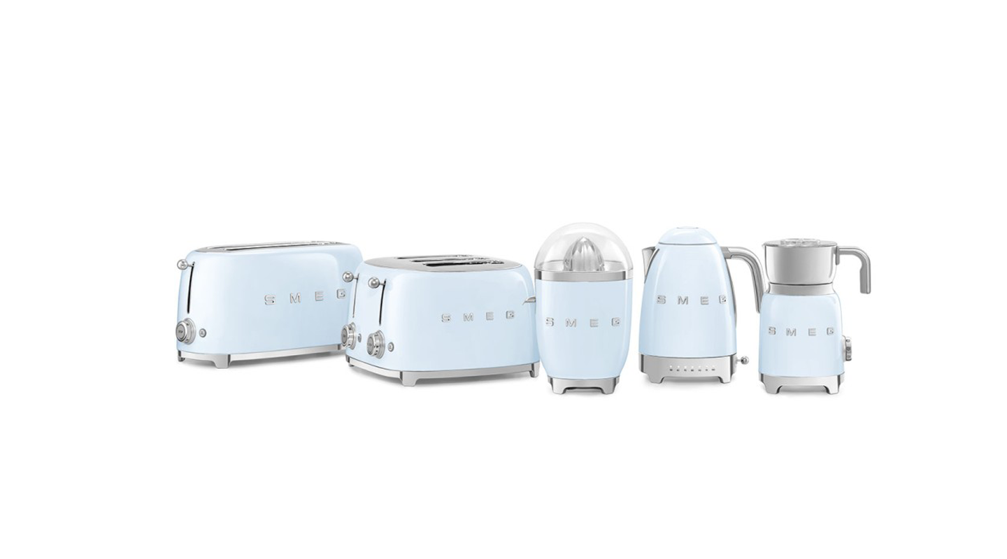 Пастельно-голубой SMEG-тостер создаёт настроение. Корпус из стальной конструкции в стиле 50-х, глянцевая отделка и хромированные детали — и при этом вы получаете мощный прибор с широкими слотами и продуманными функциями. Такой выбор отражает вкус и делает каждое утро чуть более особенным.